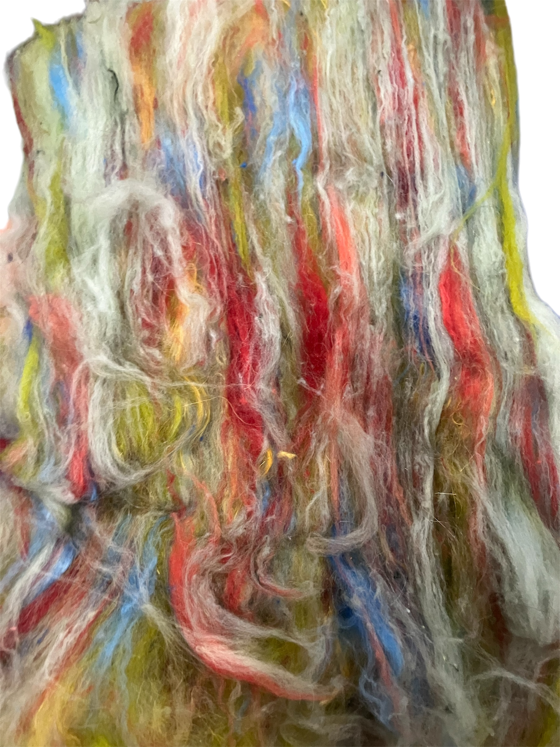 Fiber batt made using hand-dyed fibers, Wildflowers is a blend of 75% wool (Romney/Cheviot cross, Cotswold/Wensleydale cross locks), 17% bamboo, 8% pineapple. The Romney/Cheviot and Cotswold/Wensleydale wools used in this blend are strong wools with striking lock structure and wavy crimp. This blend is particularly suited to art yarns or yarns for sturdy projects such as purses or bags. The majority of the wools used at Fat Lady’s Song are processed from raw fleeces sourced directly from nearby shepherds and farmers.
