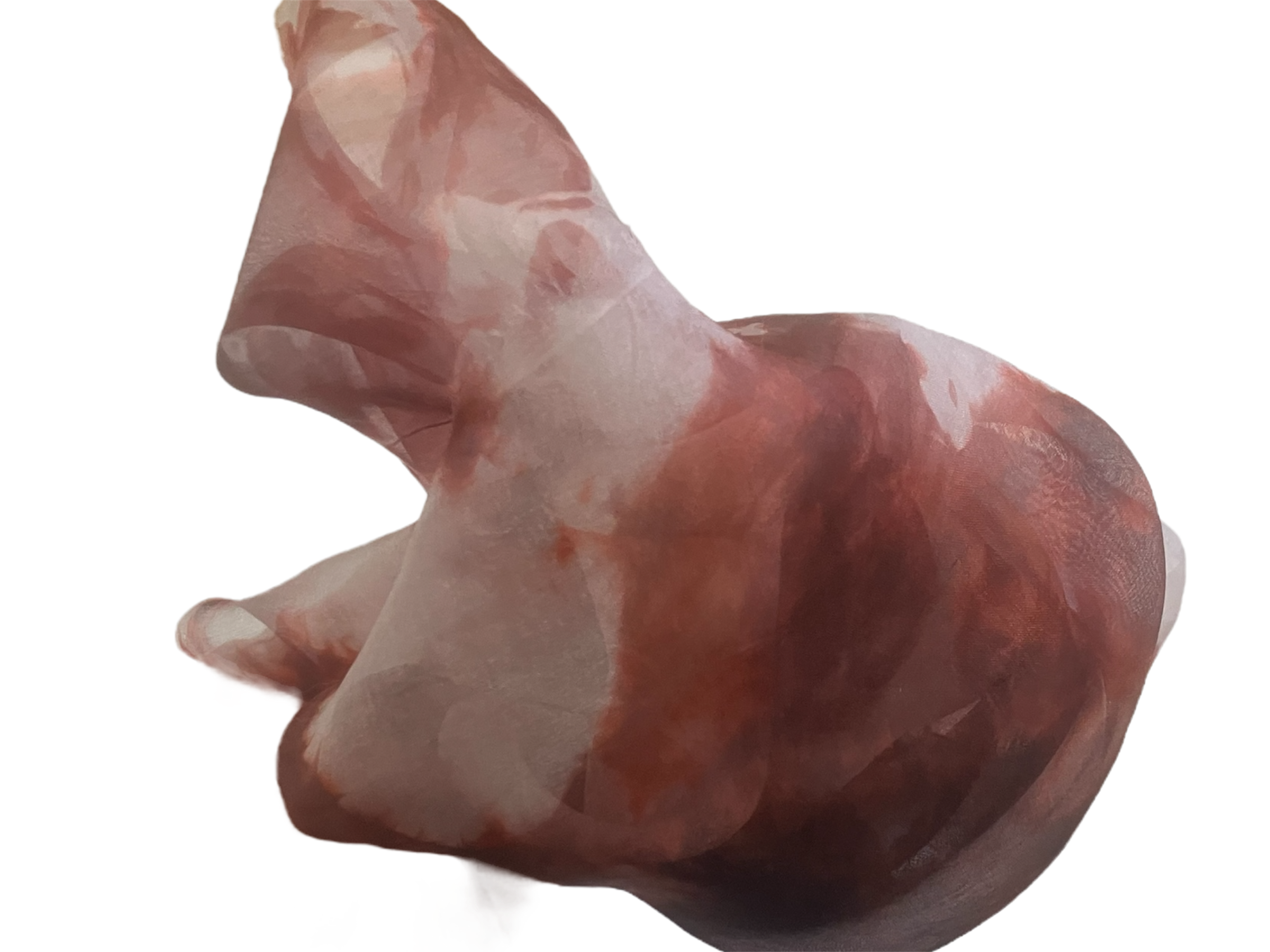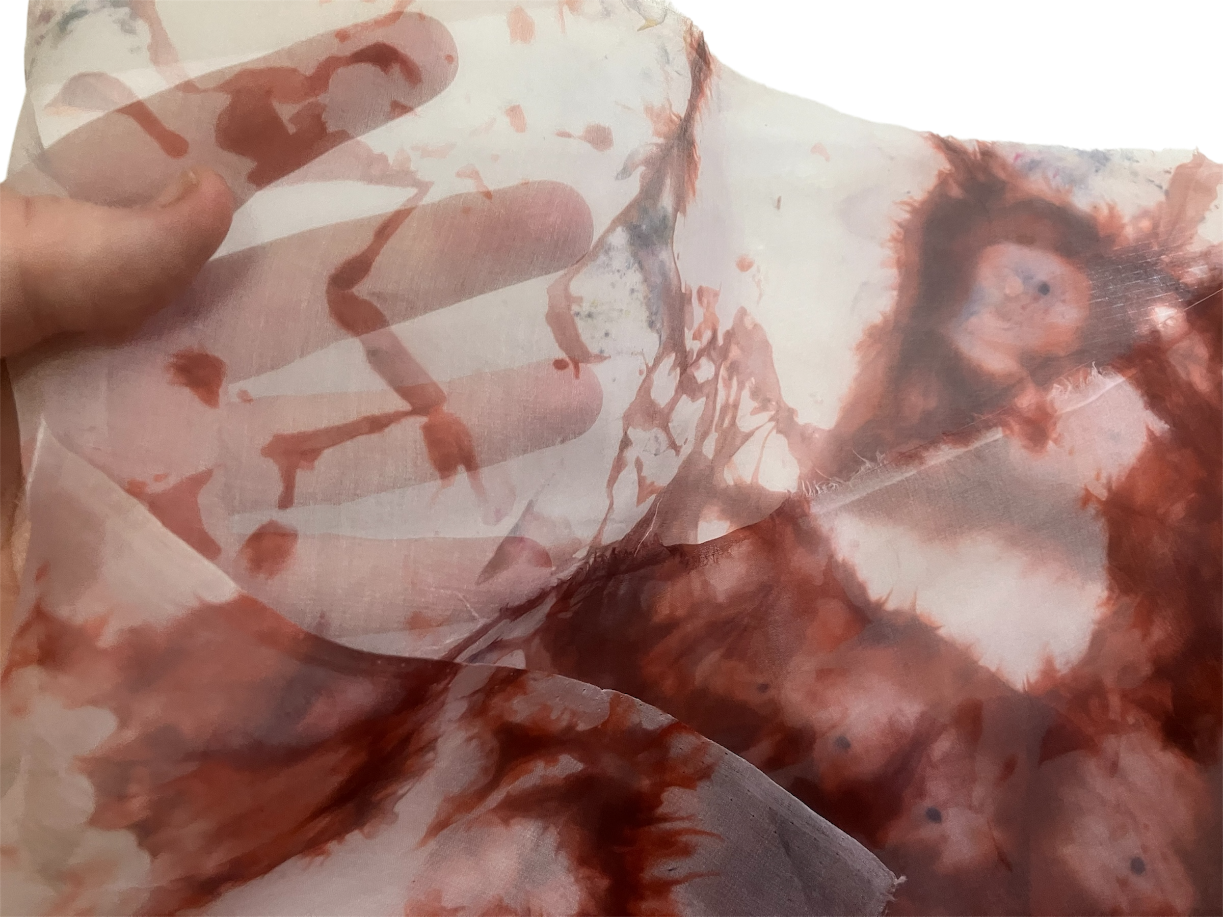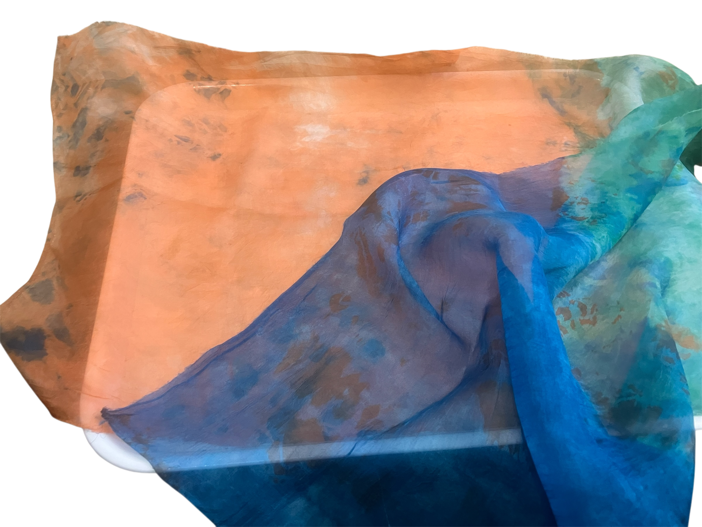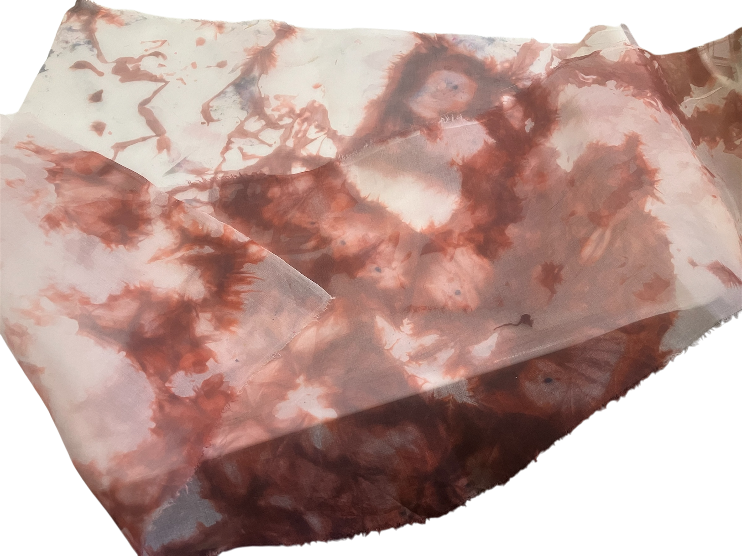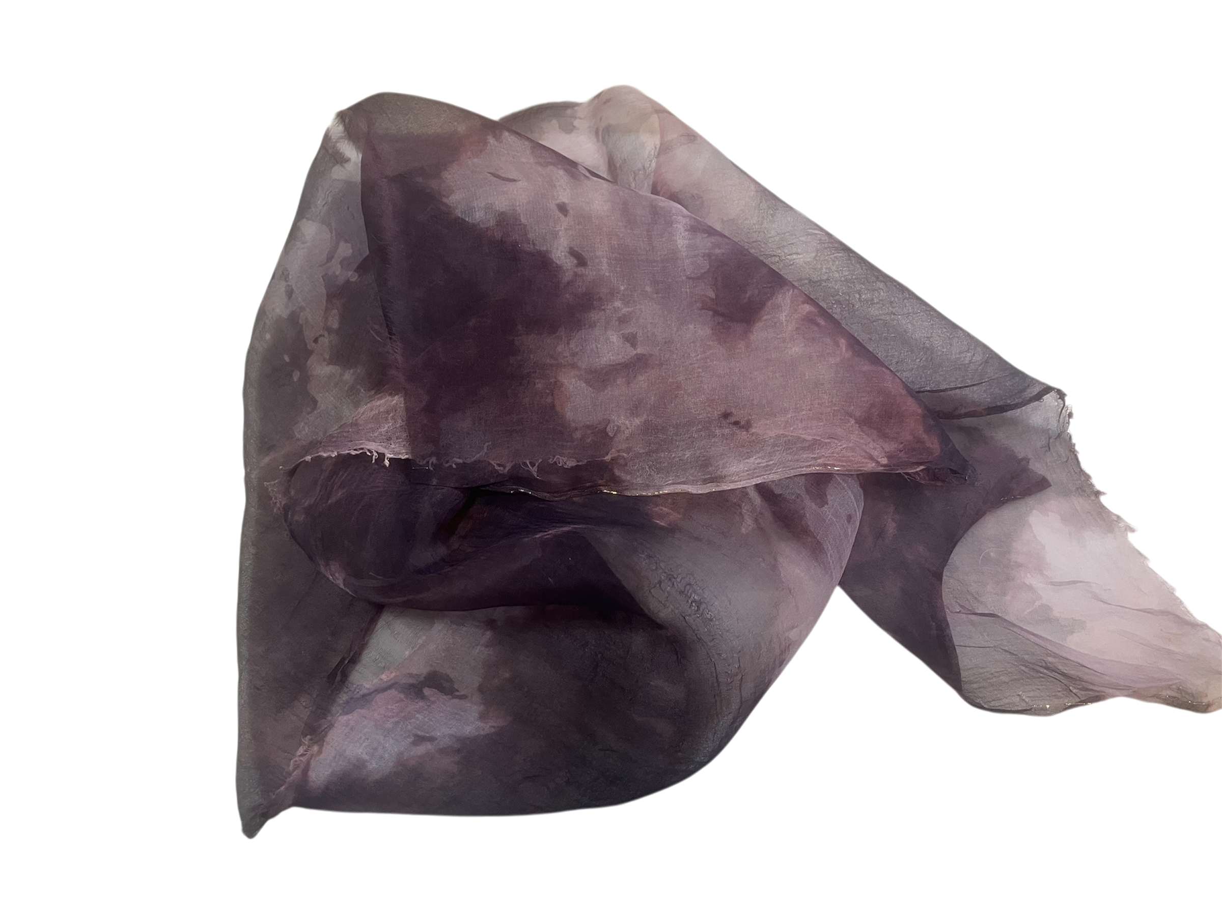 This piece is an 14×53” 5 mm organza scarf blank low-water-immersion dyed with shades of maroon and burgundy on a field of soft blue.