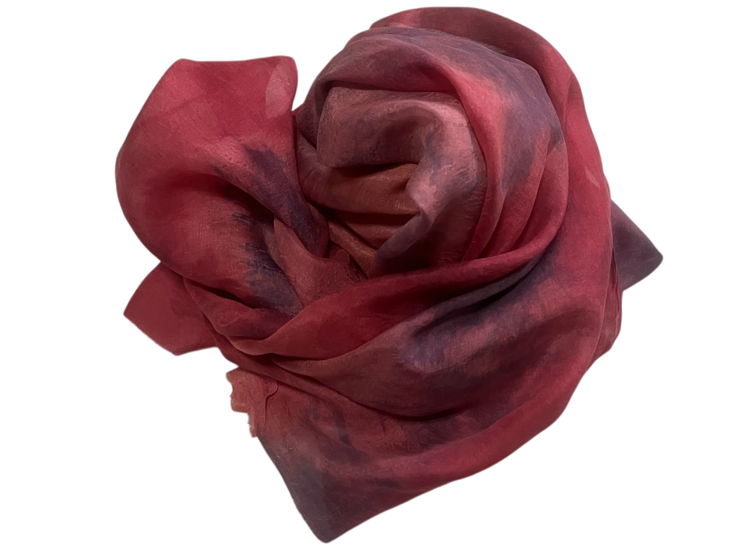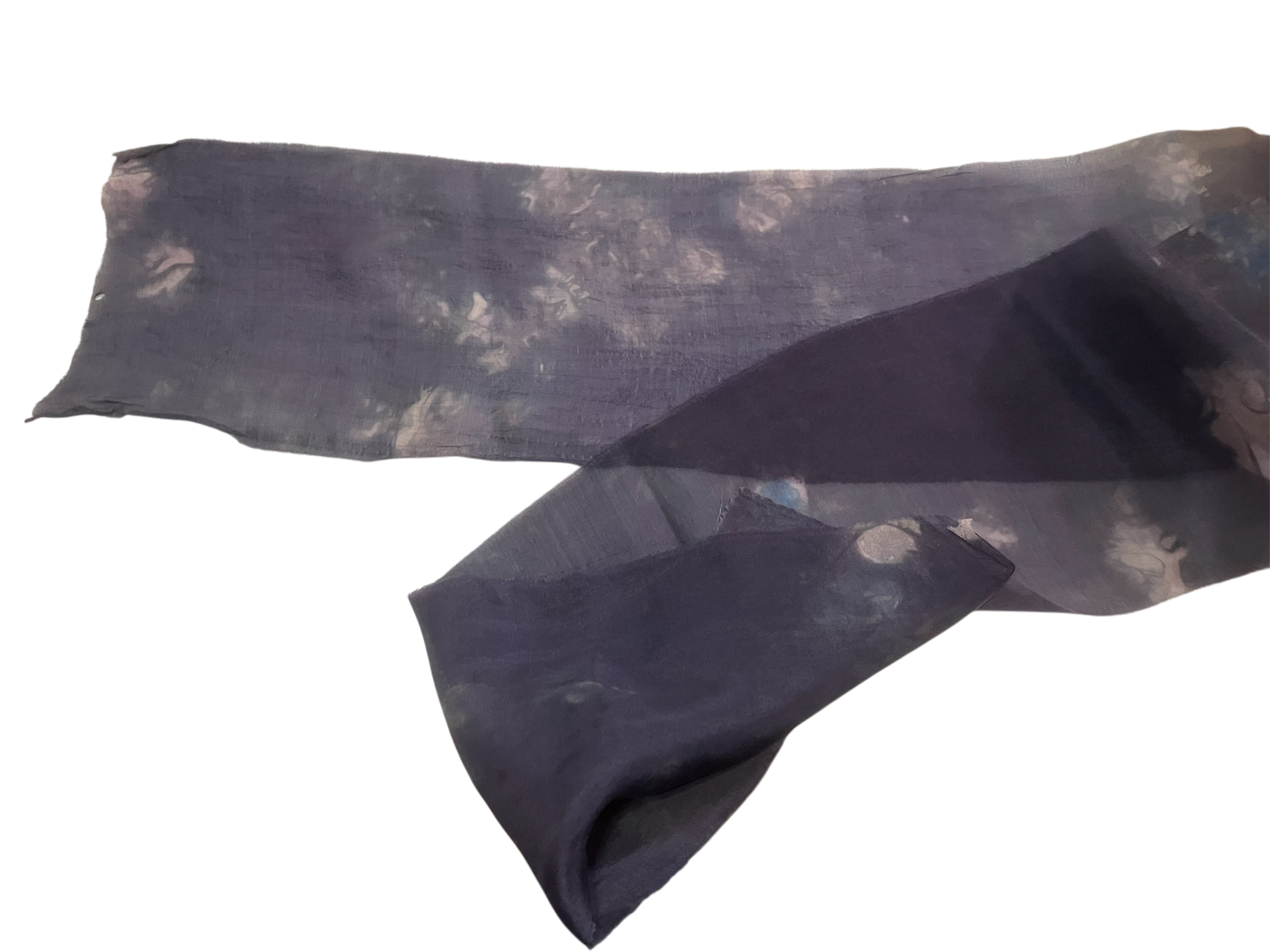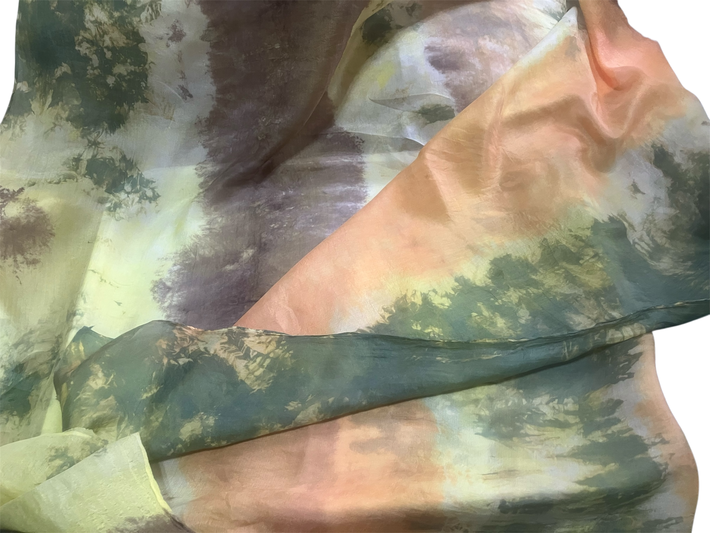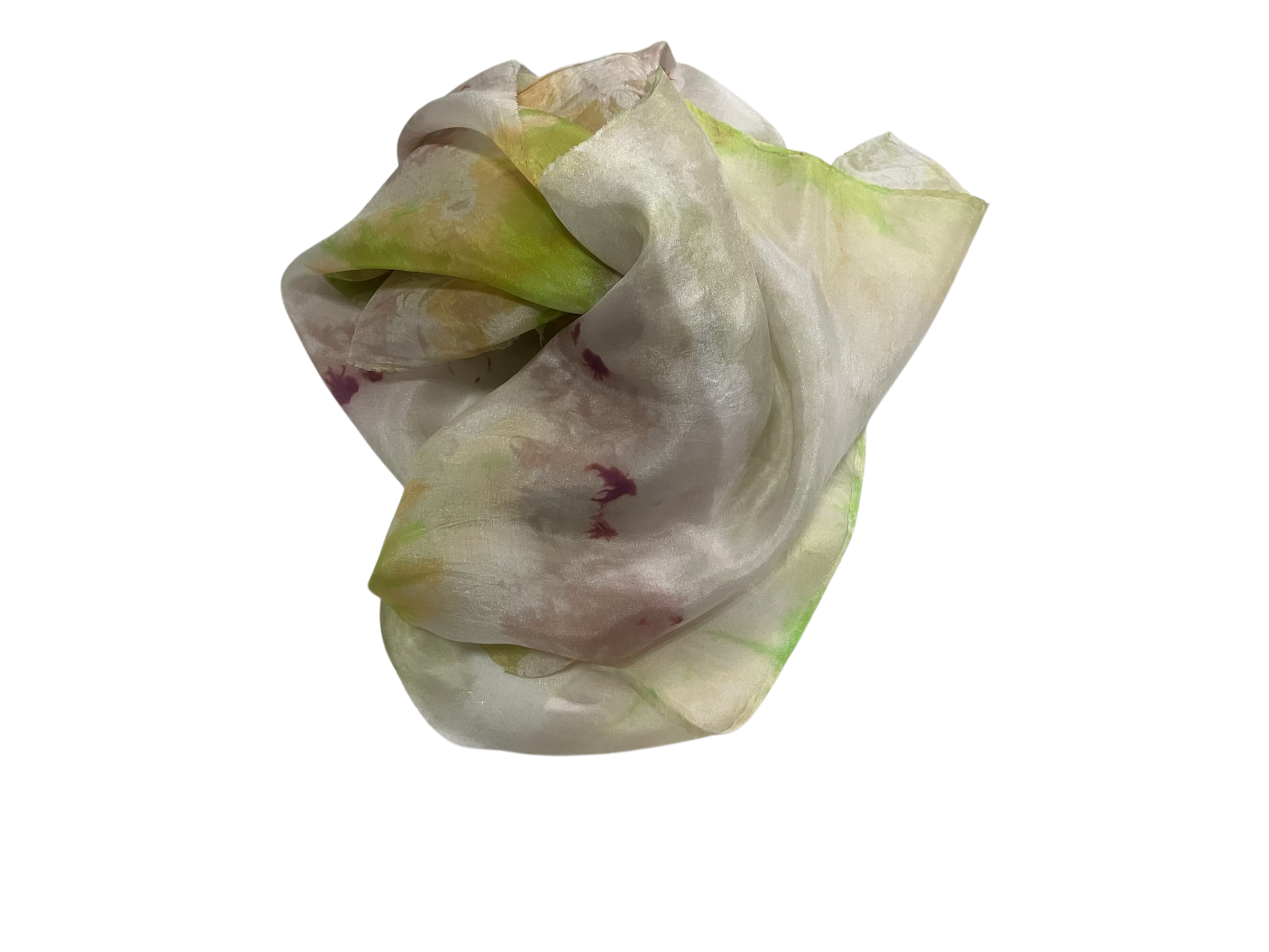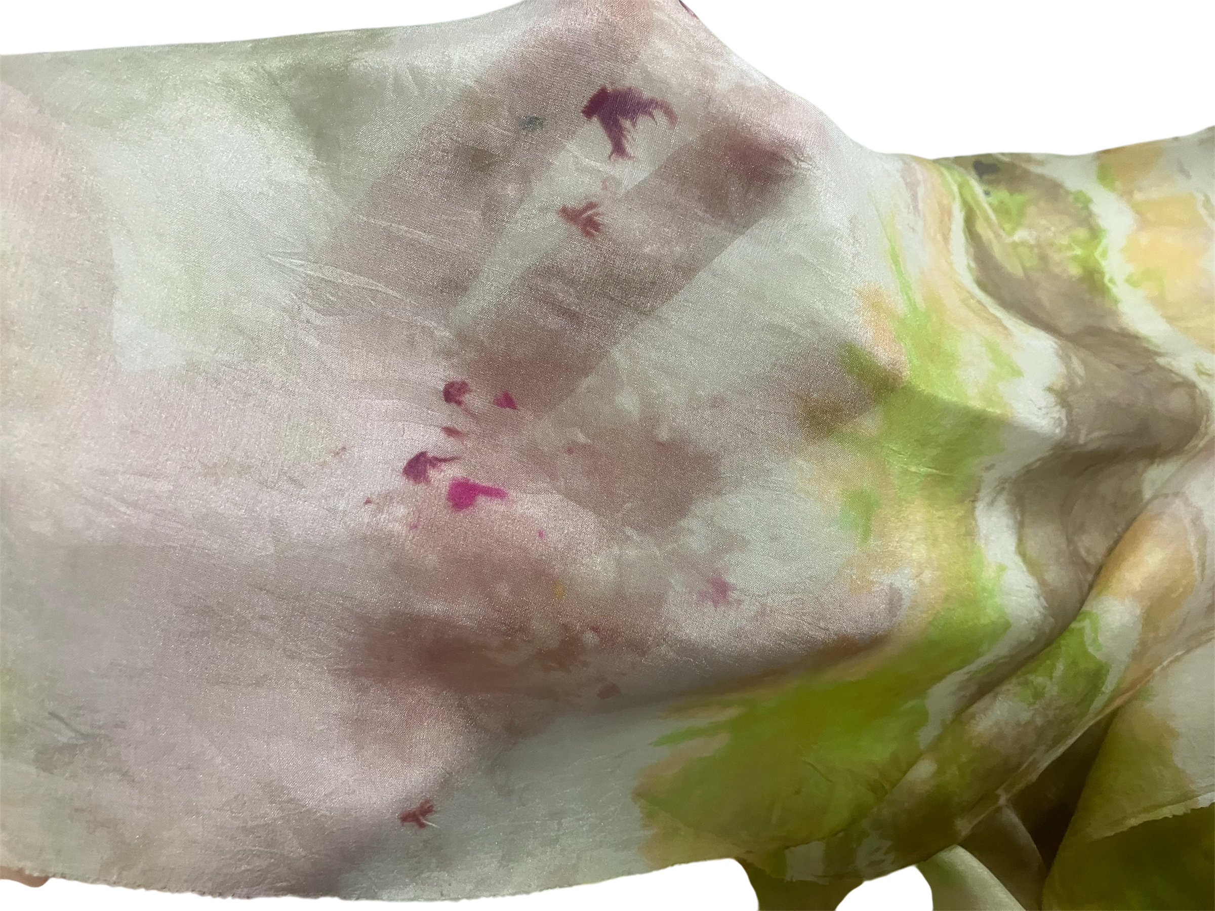 This piece is a 18×54” habotai scarf blank in violet, bright yellow and green, and a soft orange/coral..