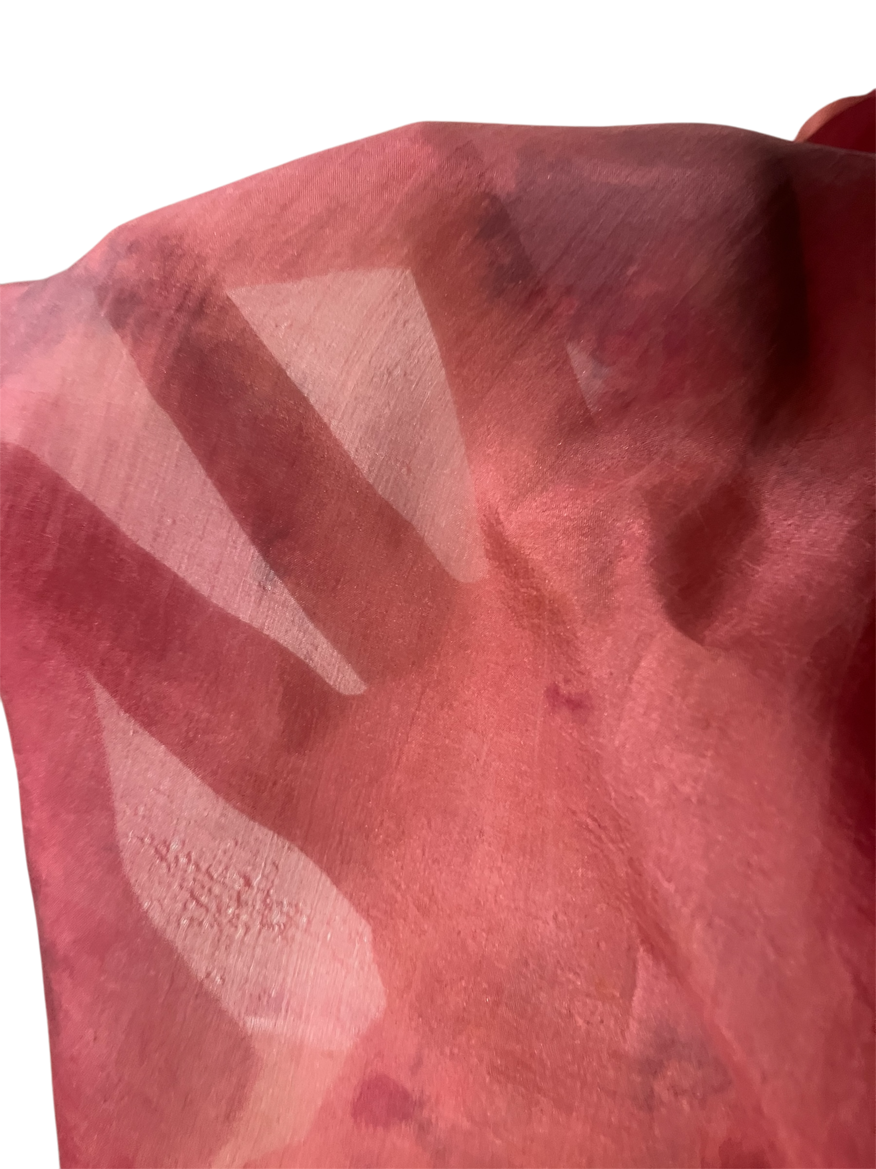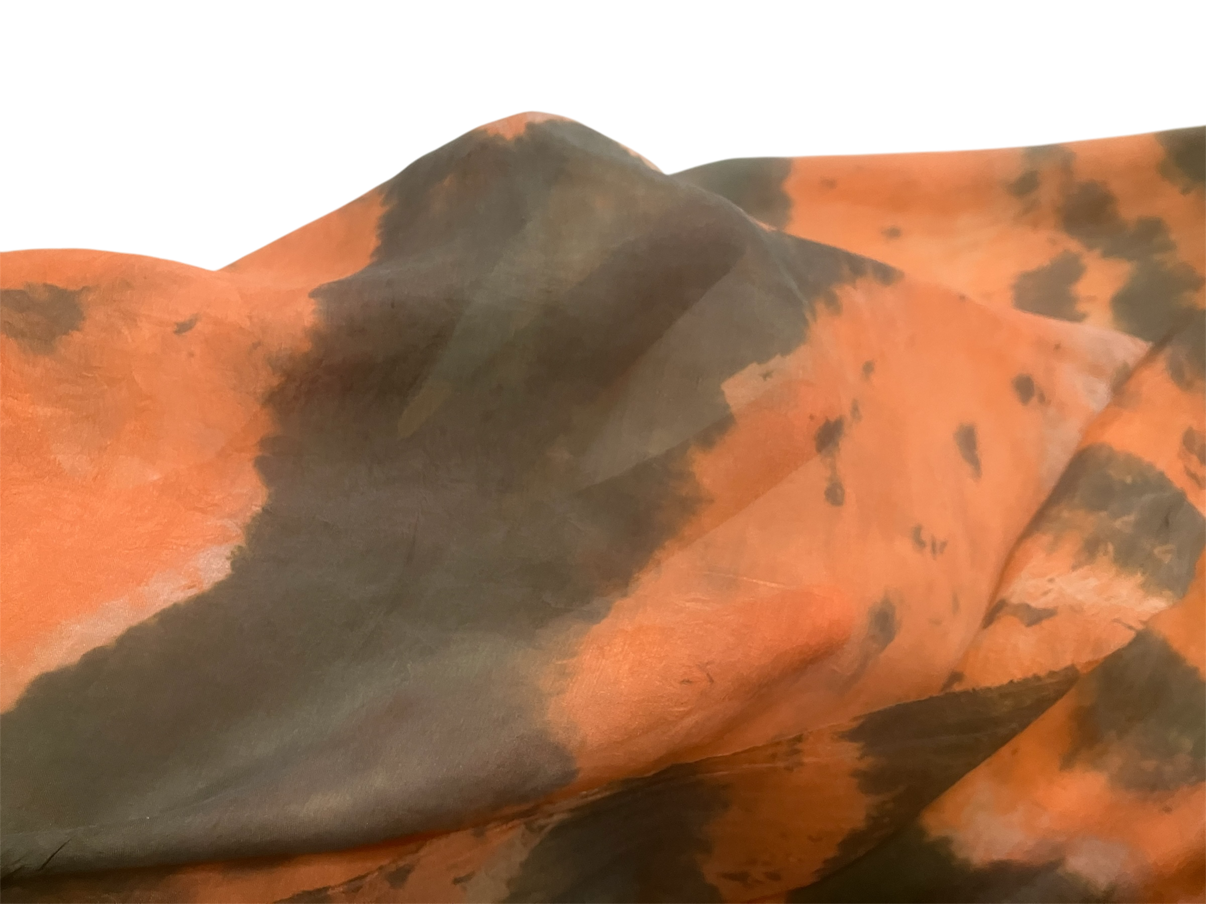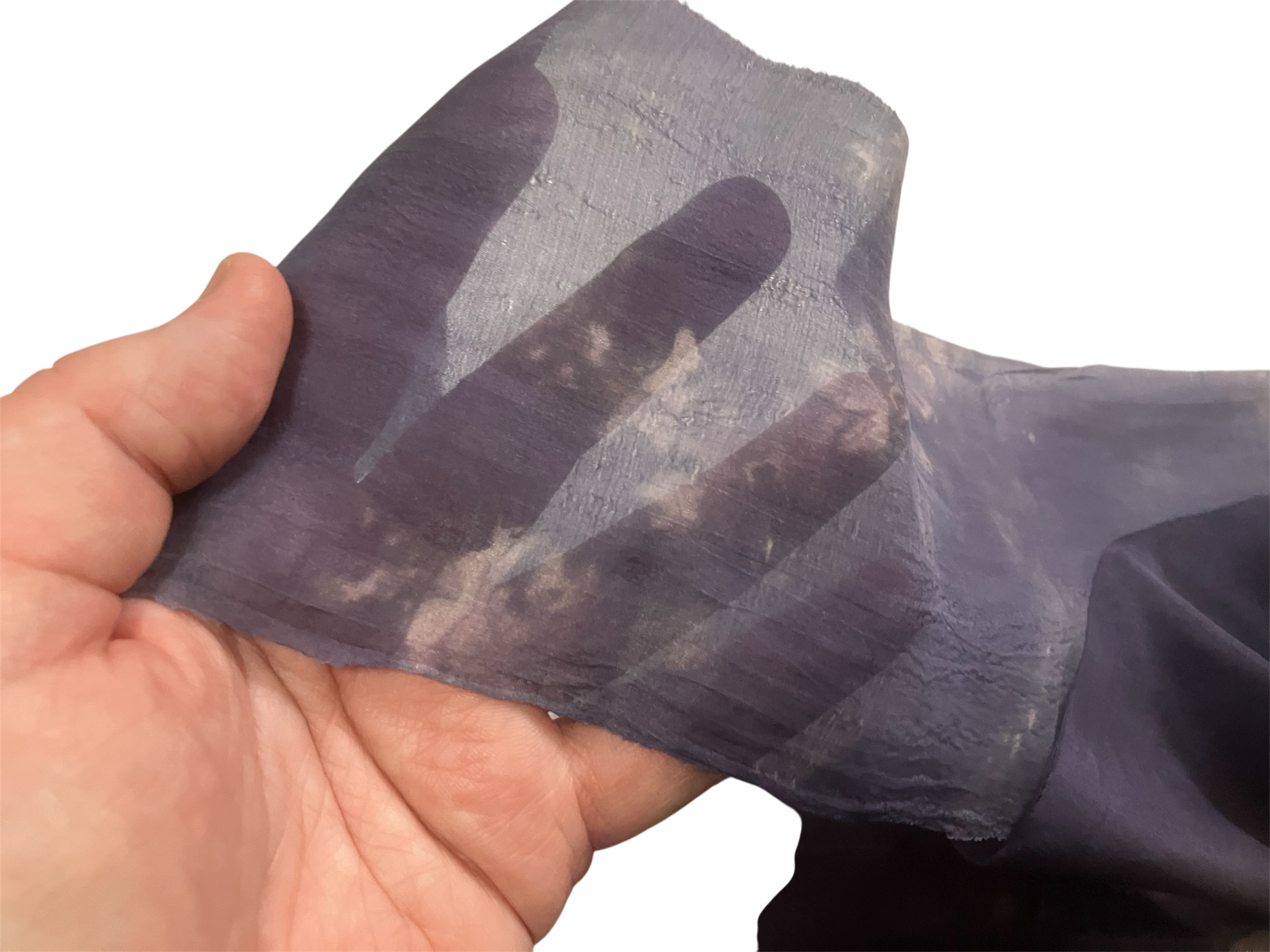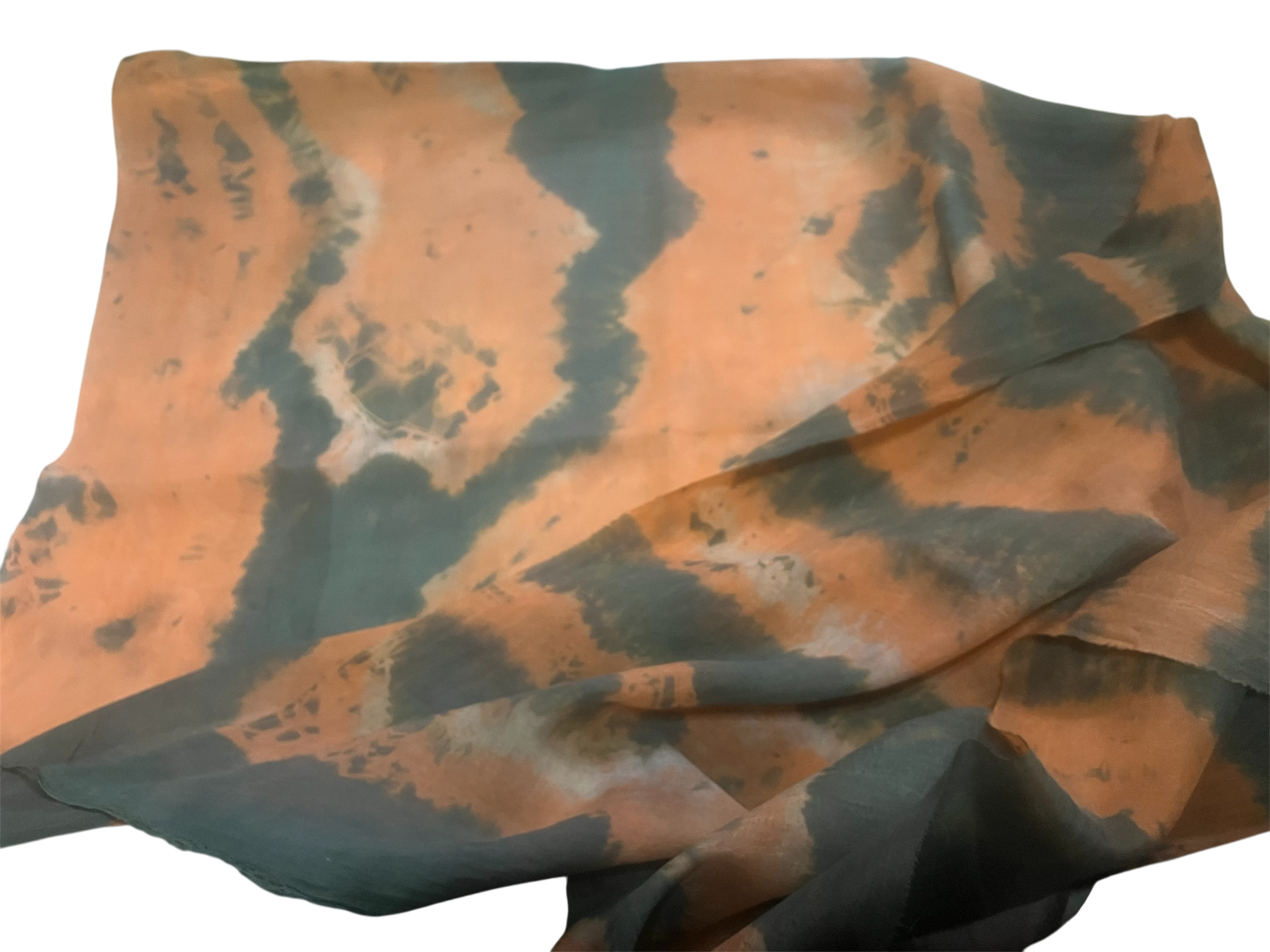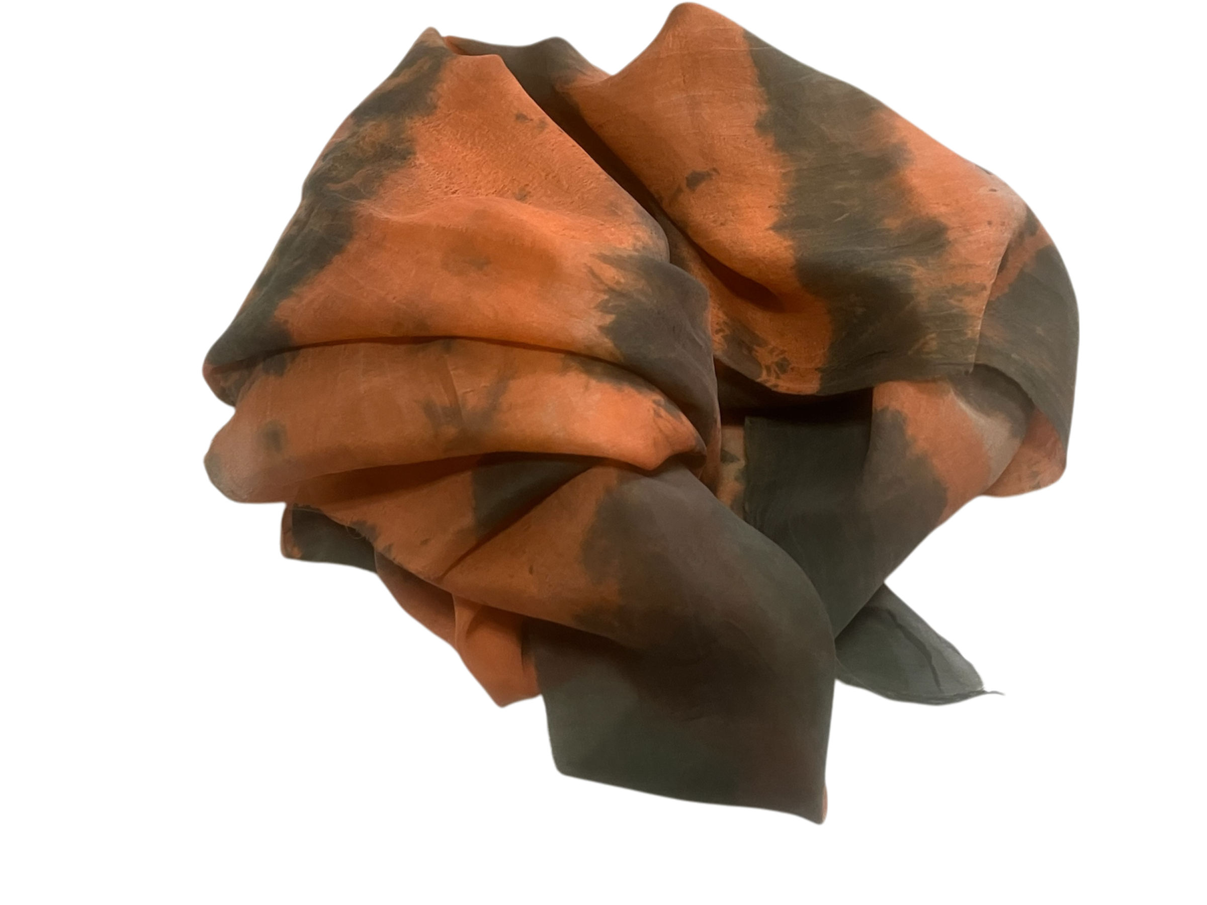 This piece is a 18×54” habotai scarf blank in violet, bright yellow and green, and a soft orange/coral..
