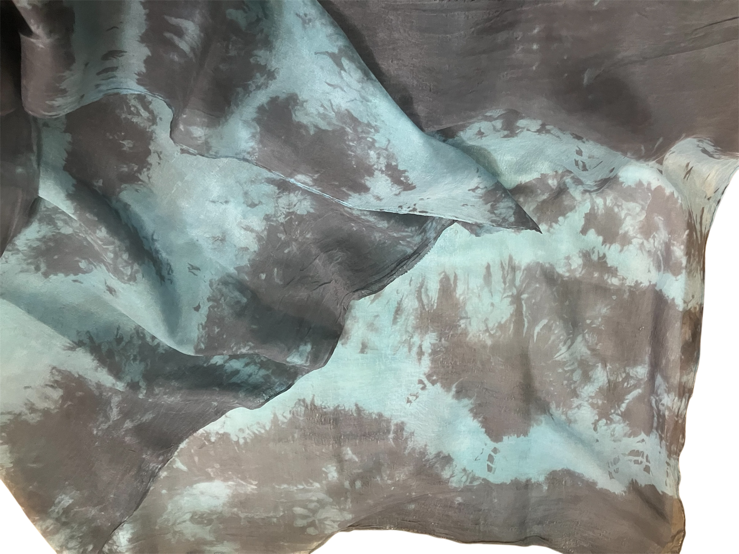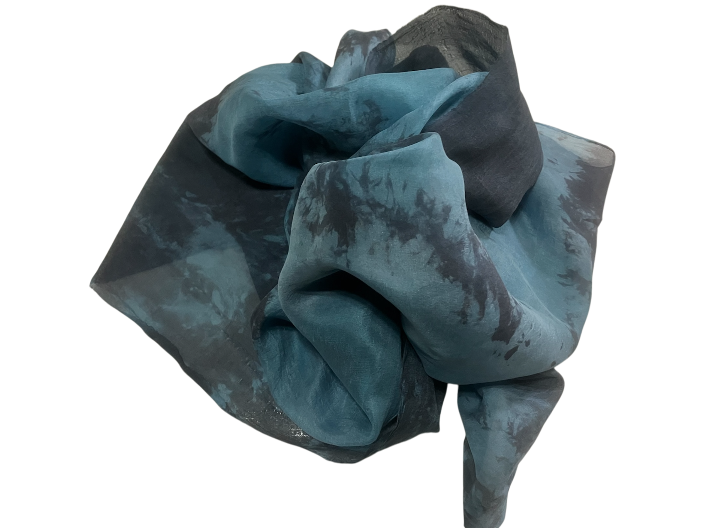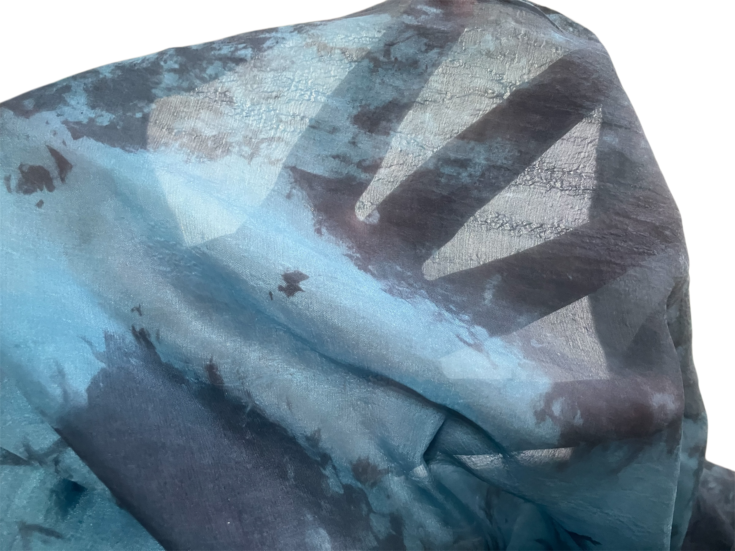 This piece is a 12×44” habotai scarf blank low-water-immersion dyed in shades of cobalt blue.